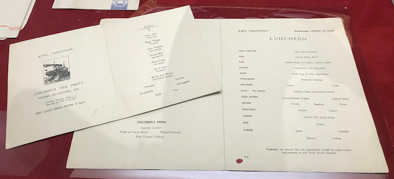 | Two menus from RMS Aquitania: a children's tea party menu from 18 October 1949 and a luncheon menu from 19 October 1949. |