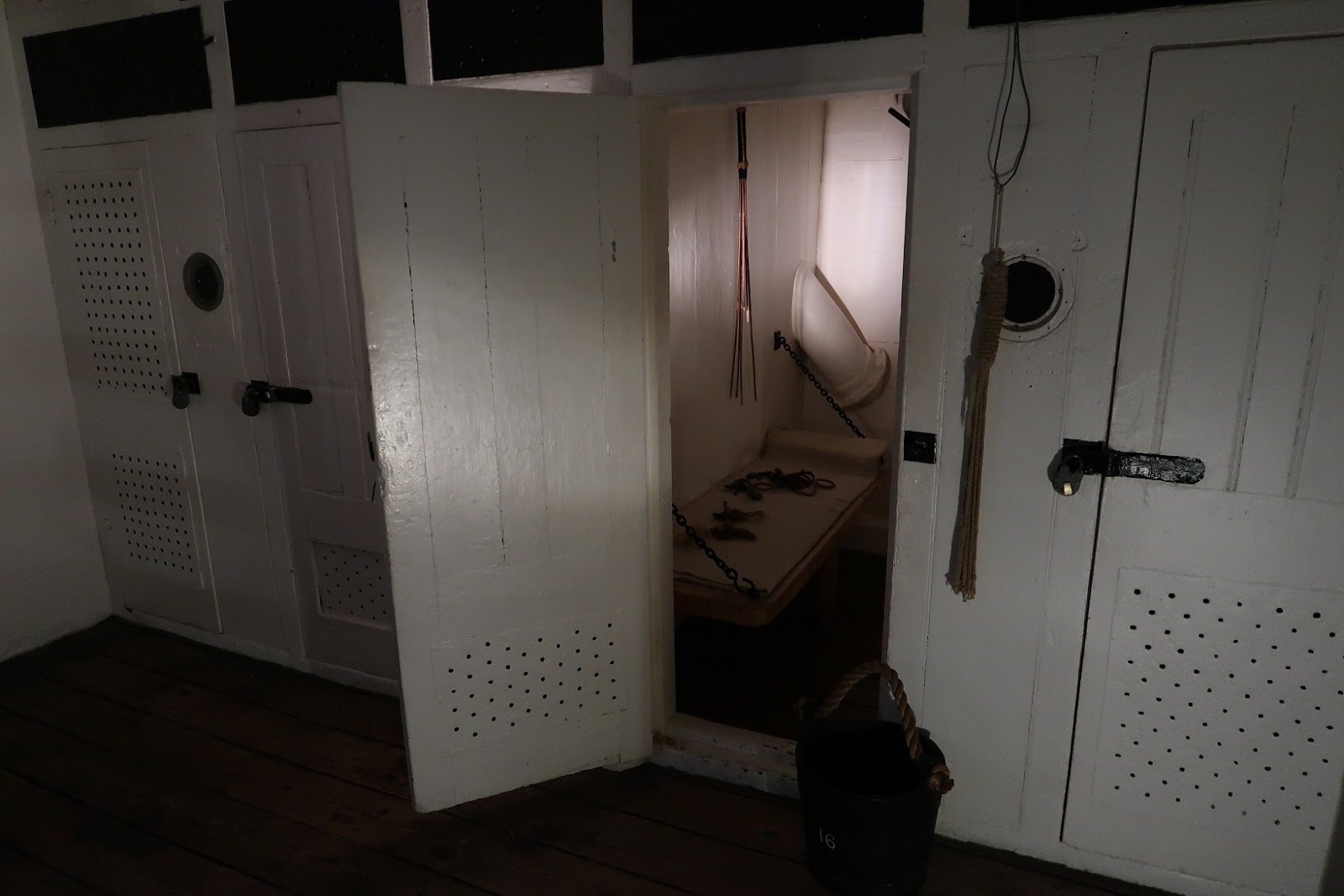 The cell flat, the ship's brig, contains two cells for punishing sailors found guilty of minor crimes or to hold men guilty of more serious offences until they could be offloaded to a jail ashore. Because every man aboard had a specific duty and was integral to Warrior's proper functioning, disciplinary infractions were usually punished by removing a sailor's good conduct badge or imposing a monetary fine deducted from the sailor's pay rather than imprisonment.