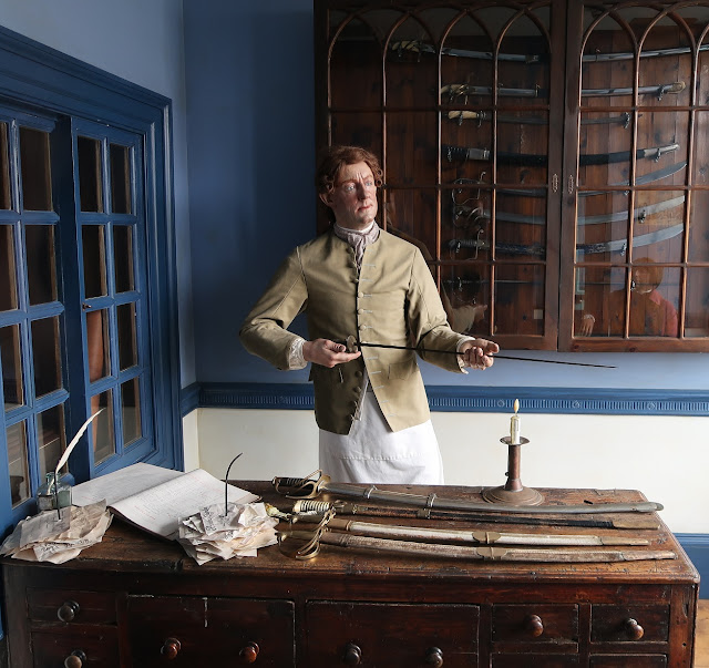 | This handsome Georgian brick building houses a naval tailor's shop on the left and the swordsmith's shop on the right. |